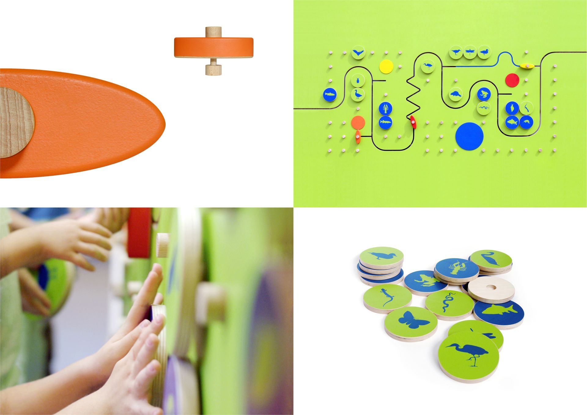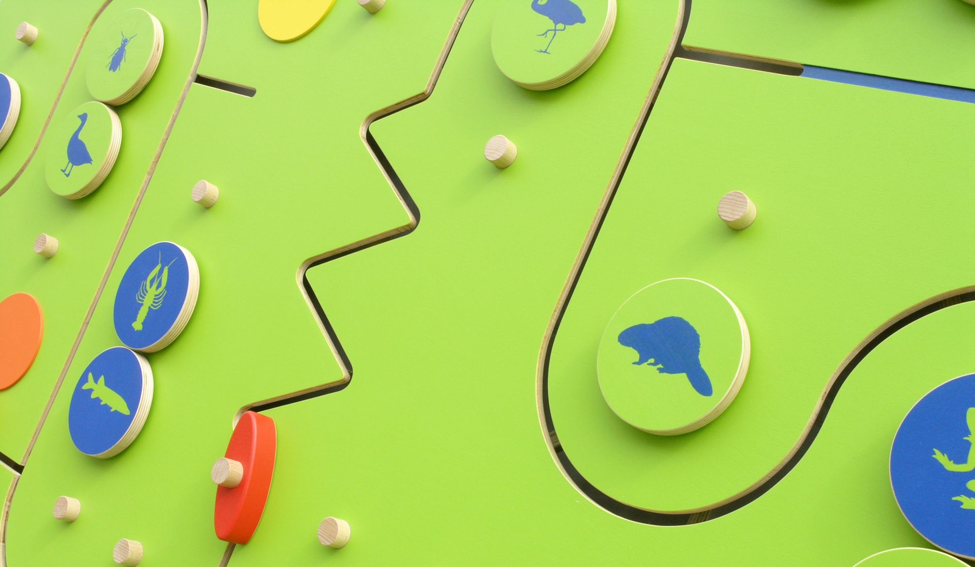 Das Konzept zur Sanierung der Kindertagesstätte "Leubener Kinderinsel" in Dresden beinhaltete eine themenbezogene Innenraumgestaltung. Für die Räumlichkeiten zum Thema >Fluss< wurde die Spieltafel "Tiere im und am Fluss" entworfen und angefertigt. Der Fluss durchquert die Landschaft in weiten Bögen. Viele verschiedene Tierarten leben hier. Auf einer Bootsfahrt können die kleinen Forscherinnen und Forscher 24 Tiere entdecken, die im und am Fluss leben. Beigefügte Merkkarten helfen bei der Namensfindung.