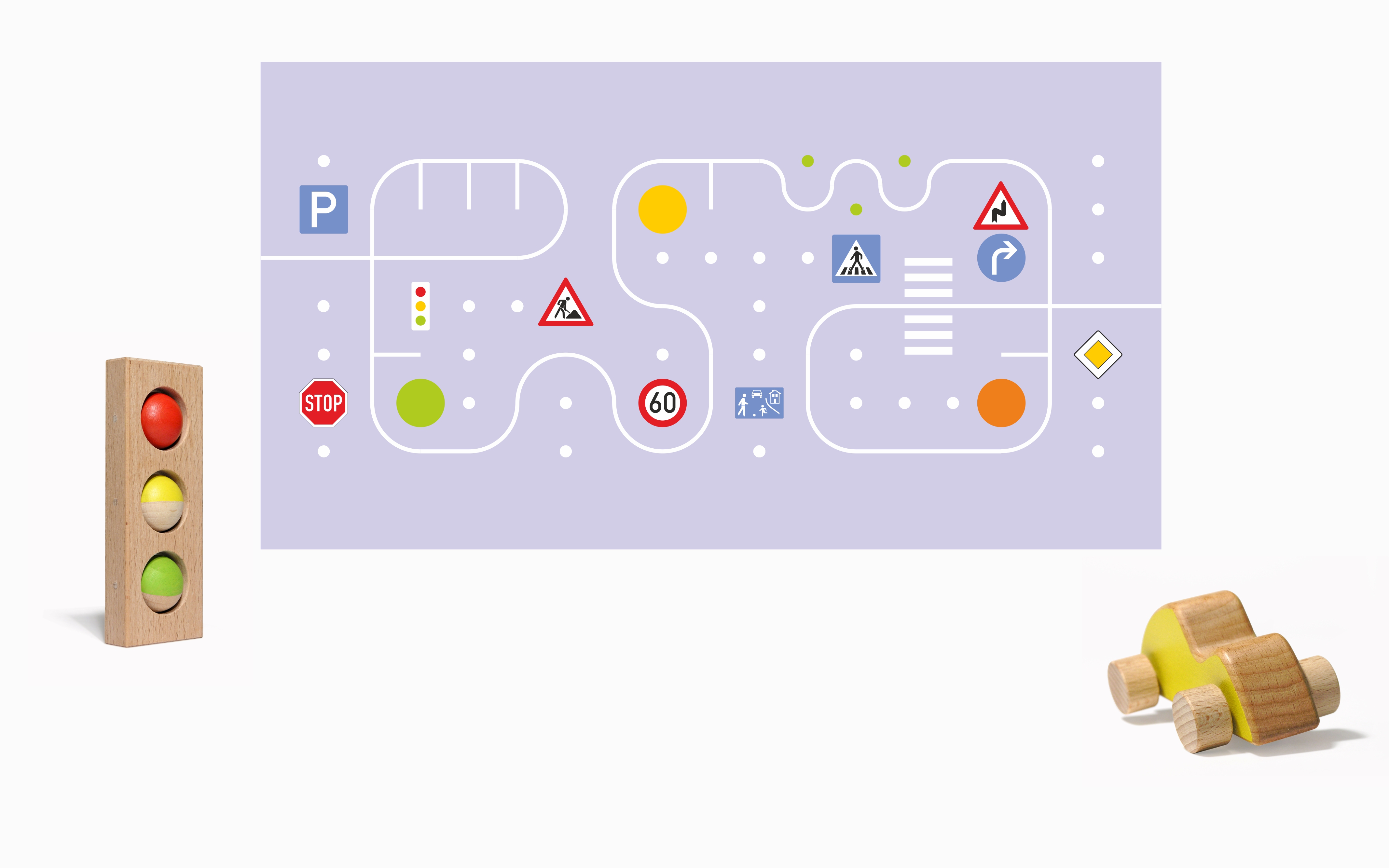 Der Entwurf „Kleine Ampel“ ist als Lern- und Spieltafel konzipiert. Das Basis-Format der Wandtafel beträgt H 96 x B 216 x T 6,5 cm. Verkehrszeichen in Form von Holzplaketten werden aufgesteckt. Die Verkehrsampel lässt sich manuell einstellen. Fahrzeuge stehen zum Spiel bereit. Für eine individuelle Wandgestaltung kann die Tafel projektbezogen angefertigt werden.